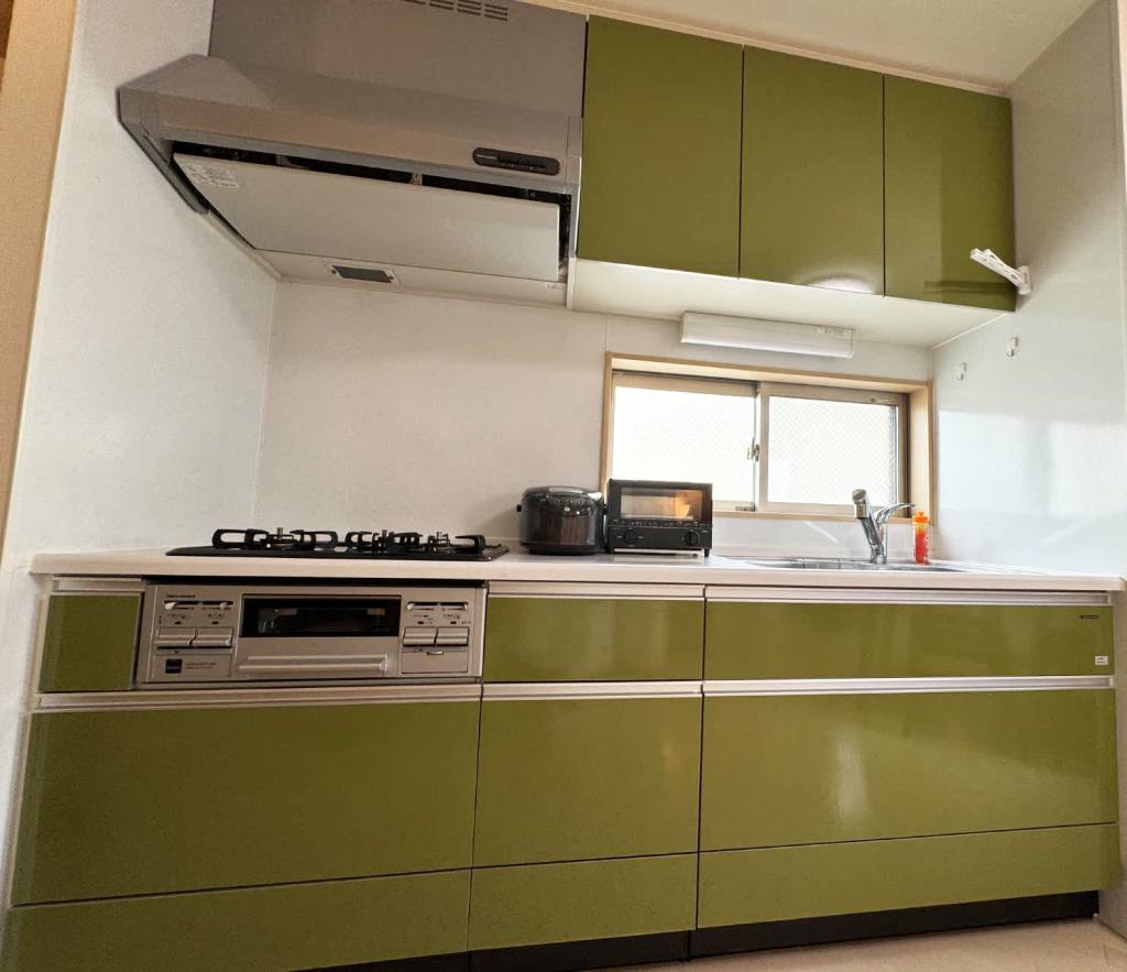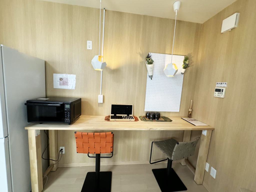室内には独立したトイレと浴室を完備しており、快適にご利用いただけます。キッチンはシステムキッチン仕様で、3口のガスコンロ、基本的な食器類、冷蔵庫を備え、自炊にも便利です。さらに、掃除機、スチームアイロン、テレビ、布製ソファなど生活に必要な家電も揃っております。